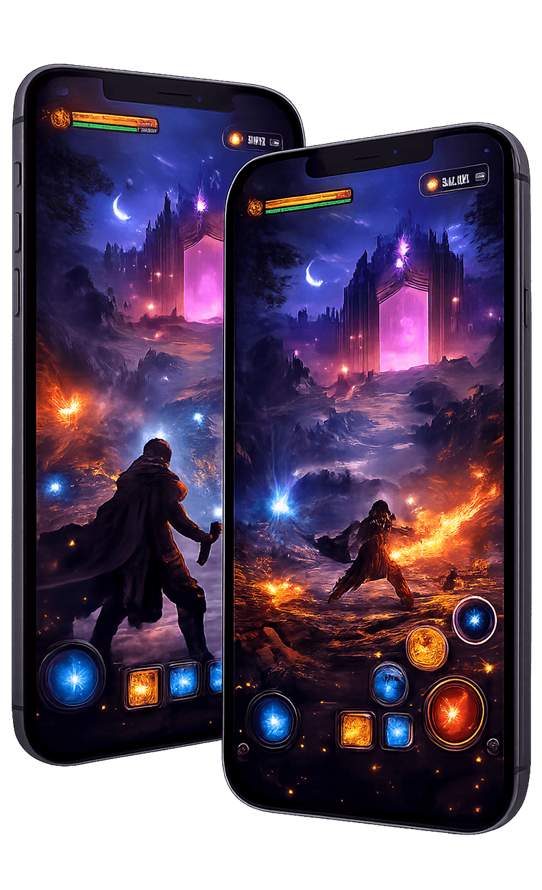 Key interface and gameplay assets built for clarity on mobile — including controls, reward screens, upgrade flows, and visual effects that support the “dark fantasy + glowing energy” style.